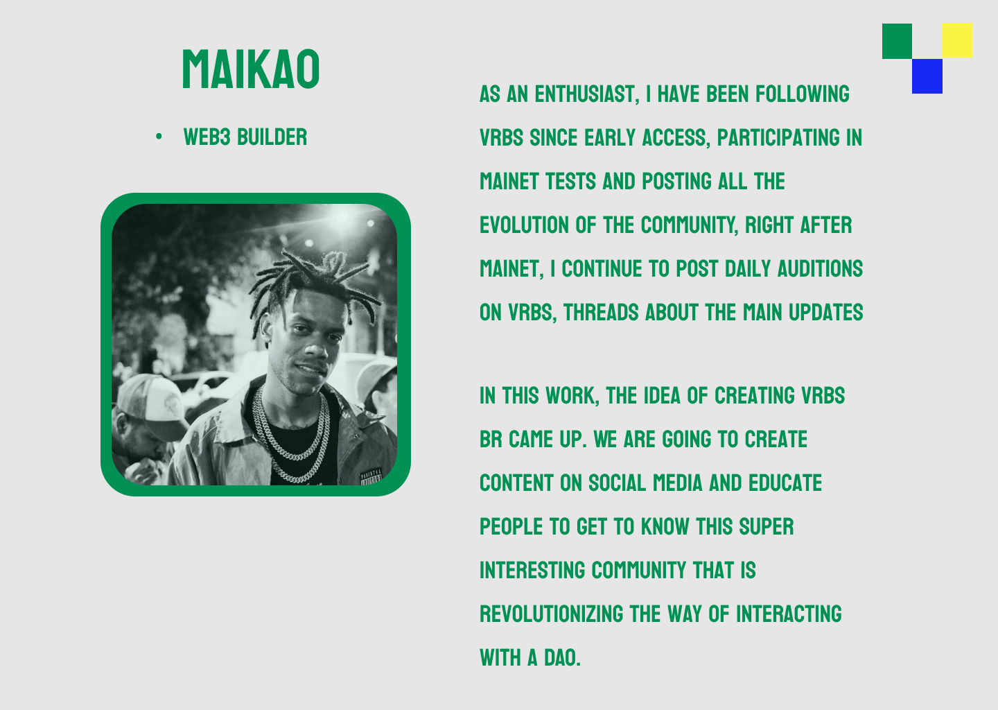 Within this work, came the idea of creating VRBS BR, we will create content on social networks and educate people to know this super interesting community that is revolutionizing the way of interacting with a DAO.